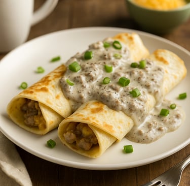 Southern-style breakfast enchiladas packed with eggs, bacon, sausage, and creamy gravy.