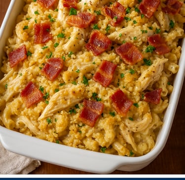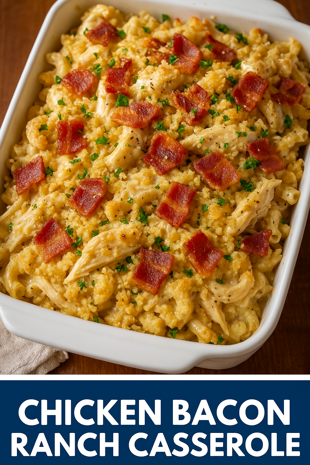 This creamy Chicken Bacon Ranch Casserole is a comfort-food family favorite made with tender shredded chicken, ranch-seasoned cheesy sauce, elbow macaroni, and crispy bacon. Baked until golden and bubbly, this easy casserole is perfect for busy weeknights, potlucks, or make-ahead meals. Every bite is rich, creamy, savory, and loaded with satisfying homestyle flavor.