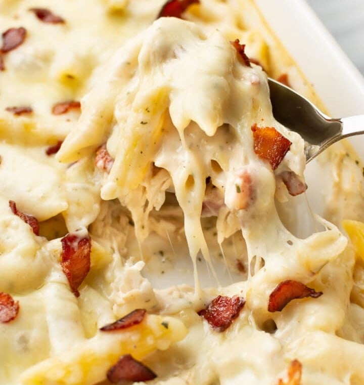 Creamy, cheesy chicken bacon casserole ready in under 45 minutes.